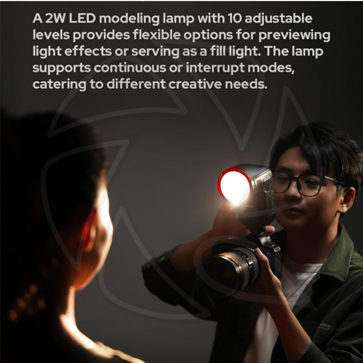 With a powerful 100W output and an innovative round head design, the V100 Flash for Sony from Godox is a compact and easy-to-use flash for portrait photographers. Designed with an integrated sub-flash, the V100 offers a 100W output and is ideal for on-location shooting. Its advanced cooling design allows for continuous shooting, offering 100 flashes at full power. The built-in 2W modeling lamp and automatic 28-105mm zoom range allows for more lighting control. The 1.7 second recycling time and the -7 to 120° tilt with 330° rotation offers greater flexibility and is compatible with Sony ADI / P-TTL systems. Easily control settings with its large touch screen back and charge the batteries directly with a USB-C cable. The V100 is also compatible with Sony cameras featuring a global shutter.